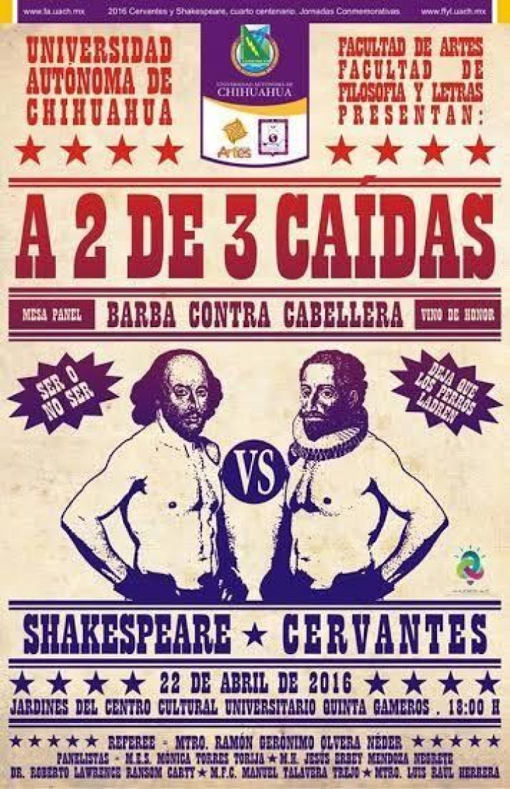 Parece que se ha abierto una fuerte discusión sobre quién merece ser más celebrado, Cervantes o Shakespeare. En la BBC se preguntaban hace poco si era justo que el bardo de Avon le estuviera haciendo sombra al inventor de la novela moderna. Quizá el mejor resumen gráfico de la pelea sea el divertidísimo cartel de la Universidad Autónoma de Chihuahua (en la imagen) en el que presentan a los dos como contendientes de una pelea de lucha libre.