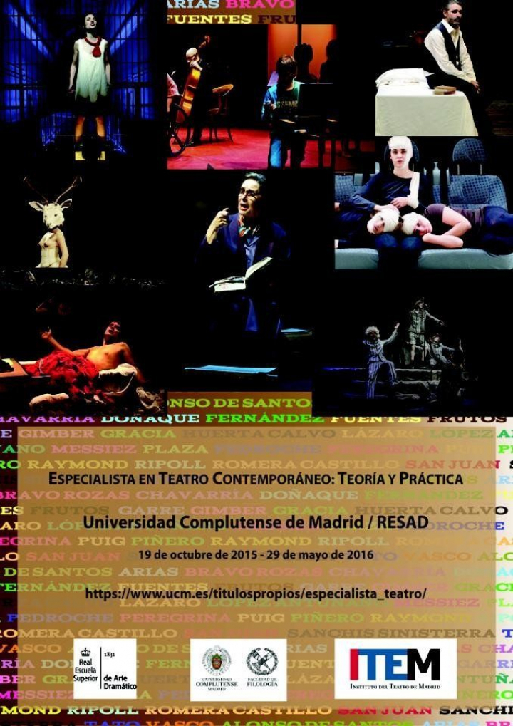 En términos académicos, podemos destacar el Curso de especialista en Teatro contemporáneo: Teoría y práctica que acaba de lanzar la Complutense y que se inicia el 19 de octubre. El curso se centra en las corrientes teatrales de la actualidad tanto desde un marco teórico como de uno práctico, y en corrientes contemporáneas en cuanto a la creación, puesta en escena, dramaturgia, adaptación, crítica y teoría teatral, formación actoral, traducción y edición de textos dramáticos. Pensado para cumplimentarse en un año académico y con un horario compatible con el laboral, el título cuenta con dramaturgos de la talla de José Luis Alonso de Santos, José Ramón Fernández, José Sanchis Sinisterra, Margarita Piñero, Laila Ripoll, Pablo Messiez; directores como Eduardo Vasco, Álvaro Tato, José Carlos Plaza o Jaime Chávarri; actores como Ernesto Arias, Mariano Gracia, Pepa Pedroche o Alberto San Juan; especialistas en técnica vocal como Vicente Fuentes o Begoña Frutos; escenógrafos como José Luis Raymond, músicos como Alicia Lázaro, y catedráticos y profesores de la UCM, la UNED y la RESAD como Cristina Bravo Rozas, Concha Doñaque, Xavier Chavarría, Sol Garre, Arno Gimber, Javier Huerta Calvo, Cristina Peregrina, David Puig, José Romera Castillo y aquí, su seguro servidor.
