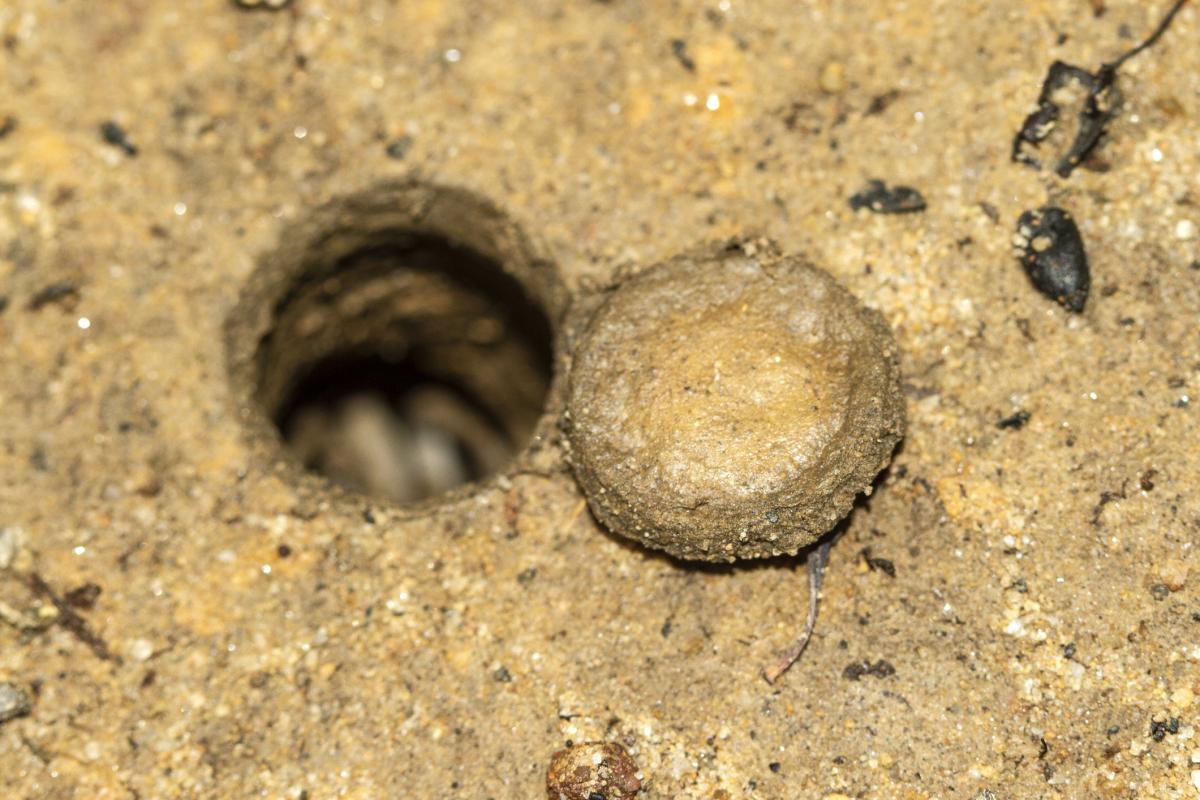 La curiosidad de esta araña es que, además de saber excavar agujeros con trampilla, posee un cuerpo duro con la forma de lo que podría parecer "una moneda" o incluso "una galleta".