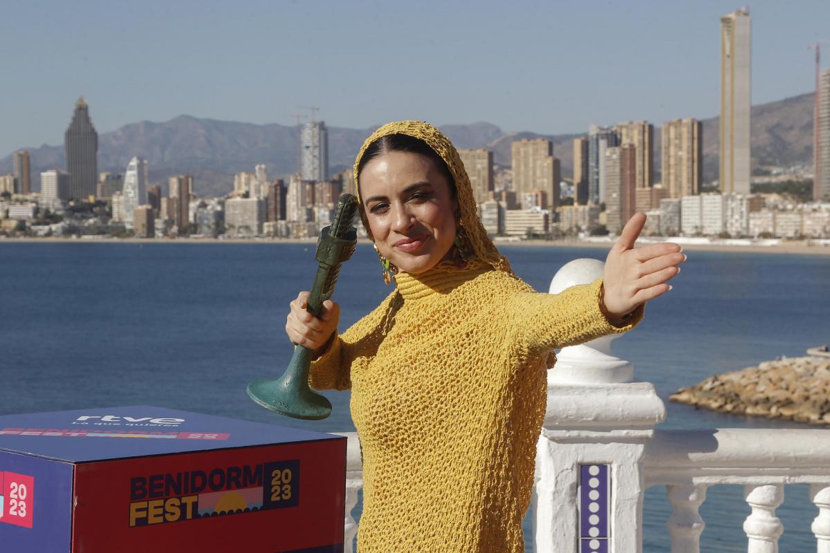Sin apenas dormir, pero con una gran sonrisa. Así ha amanecido Blanca Paloma el día después de ganar el Benidorm Fest 2023 y ser la elegida para representar a España en el festival de Eurovisión que tendrá lugar el próximo 13 de mayo en Liverpool (Reino Unido). Vestida con un traje de punto dorado, la alicantina ha posado feliz con su micrófono de bronce en el mirador de Benidorm, donde se ha citado con los medios para contar sus primeras impresiones tras el incontestable triunfo cosechado.