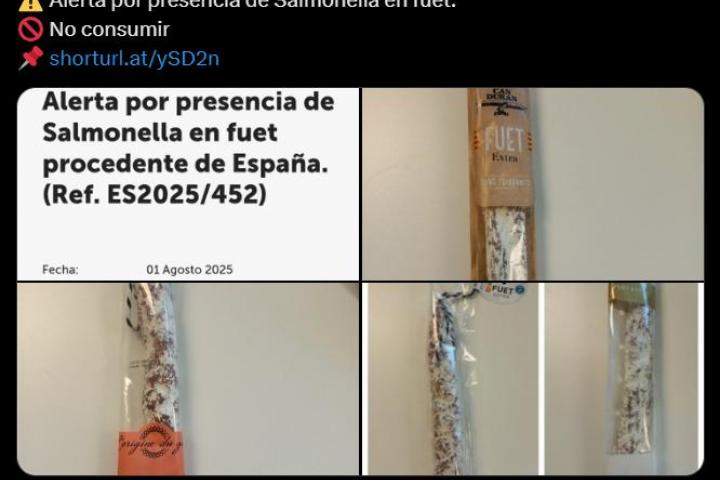 La Agencia Española de Seguridad Alimentaria y Nutrición (AESAN) ha emitido una alerta por presencia de salmonella en fuet de varias marcas procedente de España tras recibir el aviso de la Comunidad Autónoma de Cataluña.