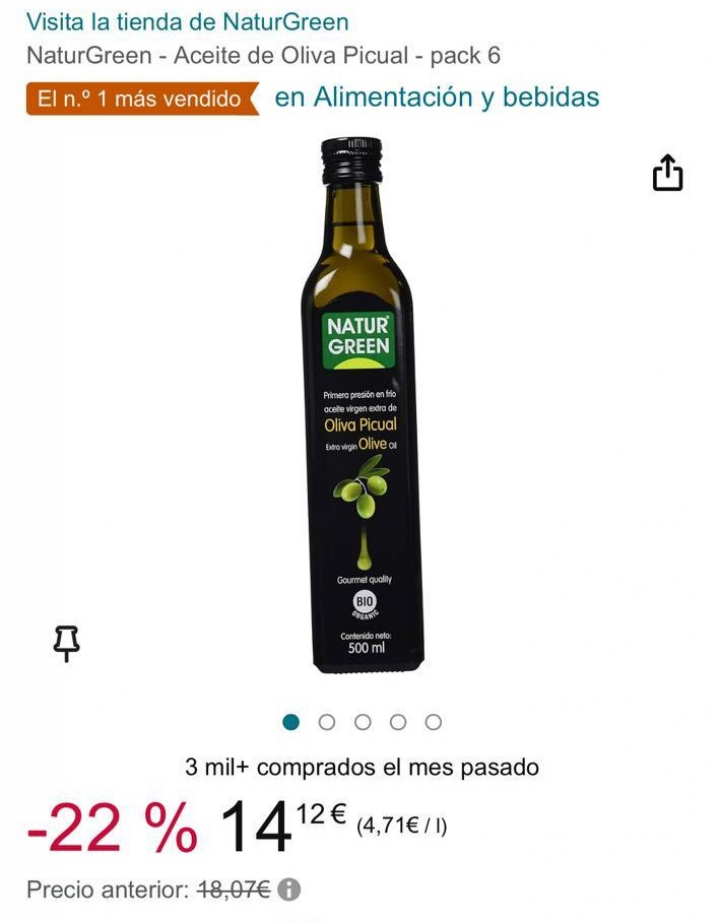 Se trata del aceite picual de la marca NaturGreen, que ha sorprendido a todo el mundo al vender una botella de un litro de aceite a 4,71 euros, tal y como apuntan en la web del gigante de compra online.