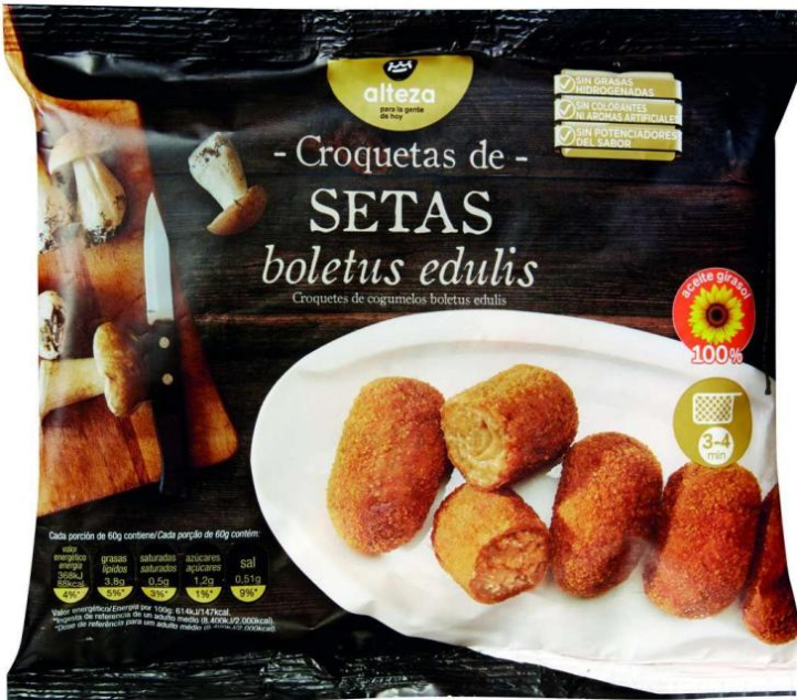 El segundo producto afectado se vende con el nombre "Croquetas de setas boletus edulis" de la marca Ateza (lote 31108 con fecha de consumo preferente abril-25). El tercero, de la marca Eroski, son las "Croquetas de boletus edulis" (lotes 30610 con fecha de consumo preferente nov-24 y 31122 con fecha de consumo preferente abril-25)