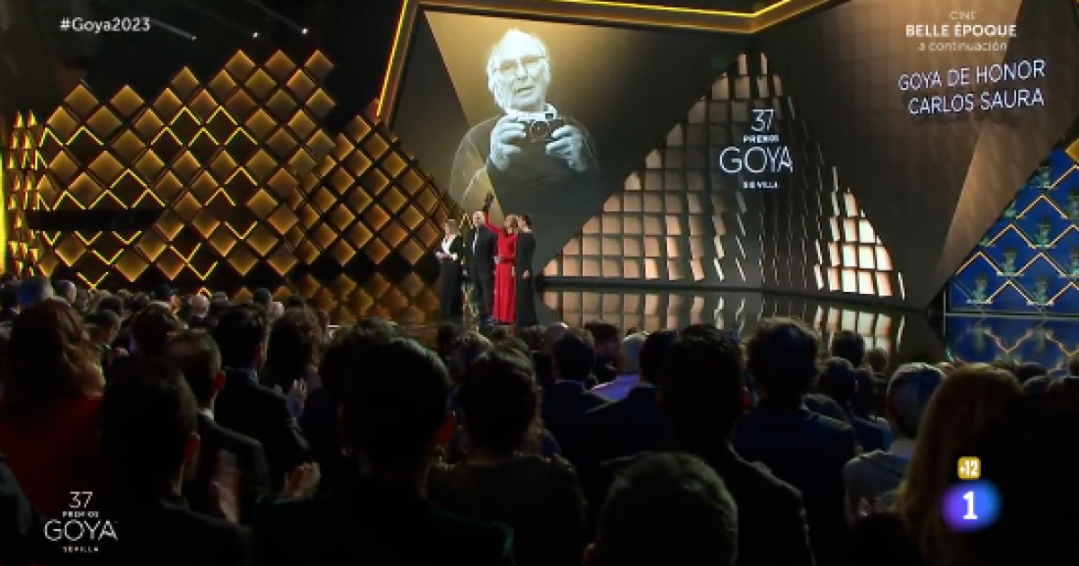 La gala ha empezado con un sentido homenaje a Carlos Saura. El director iba a recoger el Goya de Honor pero falleció este viernes en su domicilio de Madrid. Carmen Maura, protagonista de ¡Ay, Carmela! ha sido la encargada, entre lágrimas, de presentar el galardón y entregárselo a su viuda, Eulalia Ramón y a dos de sus hijos, Antonio y Anna, aunque el cineasta pudo recibir la estatuilla en su casa hace unos días.