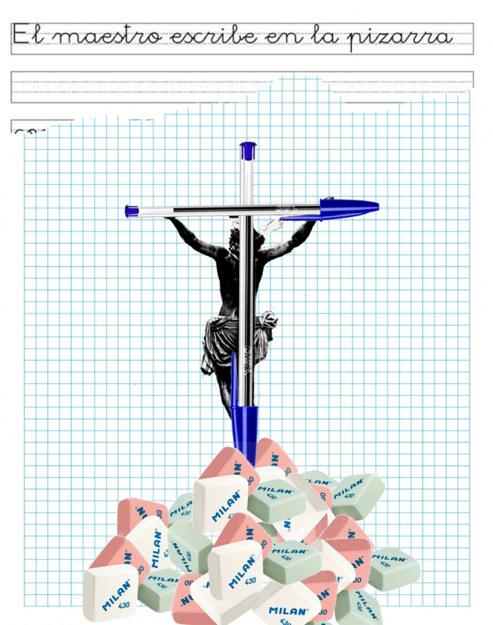 "Es una bomba, salir cualquier día de Semana Santa a la calle y encontrarte con ese teatro con tantos elementos sensoriales para mí es fascinante", indica. Este proyecto personal de collage con distintos elementos cotidianos, geométricos, influenciado tanto por la música de artistas como Elton John, David Bowie o Los Beatles vio la luz tras el consejo de sus amigos ya que en un inicio consideraba que era "material sensible".