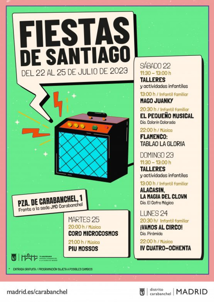 Este próximo sábado 22 de julio de 2023 arrancan las fiestas de Santiago en Carabanchel (Madrid). Se extenderá hasta el próximo martes en el que se podrá disfrutar de actividades variadas para todos los públicos.