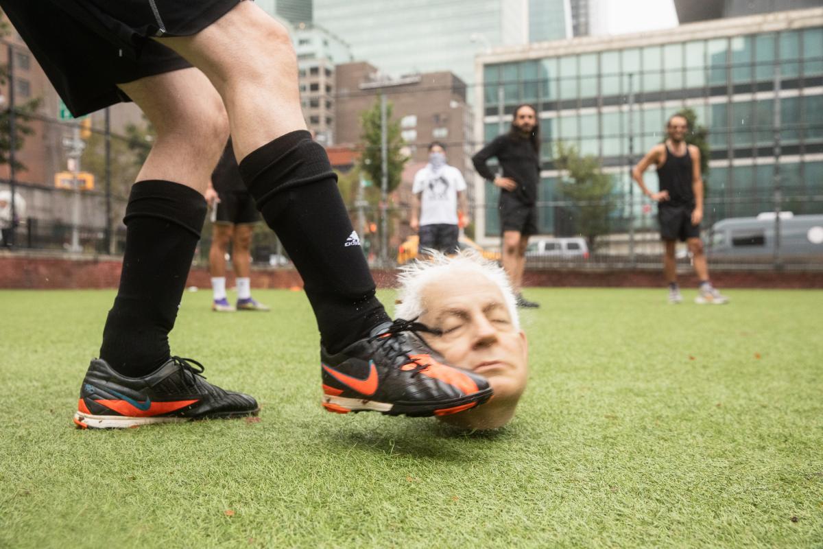 En Tijuana, puso a un grupo de personas a jugar al fútbol con la cabeza de Donald Trump justo al lado de la valla que les separa de Estados Unidos; en São Paulo, jugadores LGTB+ jugaron con la cabeza de Jair Bolsonaro, el expresidente de Brasil; en Washington, en un campo próximo al Capitolio, otros patearon la cabeza de Vladimir Putin; y, en España, varios antifascistas compitieron con la cabeza de Francisco Franco frente a las trincheras de las Coves del Toll en Moià; y, ahora, Eugenio Merino ha repetido la misma acción, esta vez con la cabeza del primer ministro israelí, Benjamin Netanyahu. El artista español, conocido por obras como el Punching Franco o el ninot del rey Felipe VI junto a Santiago Sierra, ha lanzado una nueva acción de la serie Freedom Kick que realiza en colaboración con el colectivo de artistas INDECLINE. Según ha anunciado en su Instagram, este domingo, 7 de septiembre, varios activistas y ciudadanos tanto judíos como palestinos disputaron un partido de fútbol "utilizando como balón una réplica ultrarrealista de la cabeza de Netanyahu". Todo ello frente a la sede de la ONU en Nueva York.