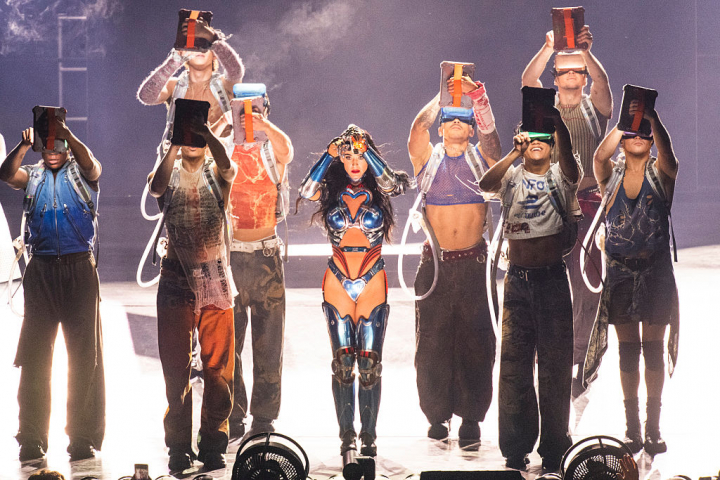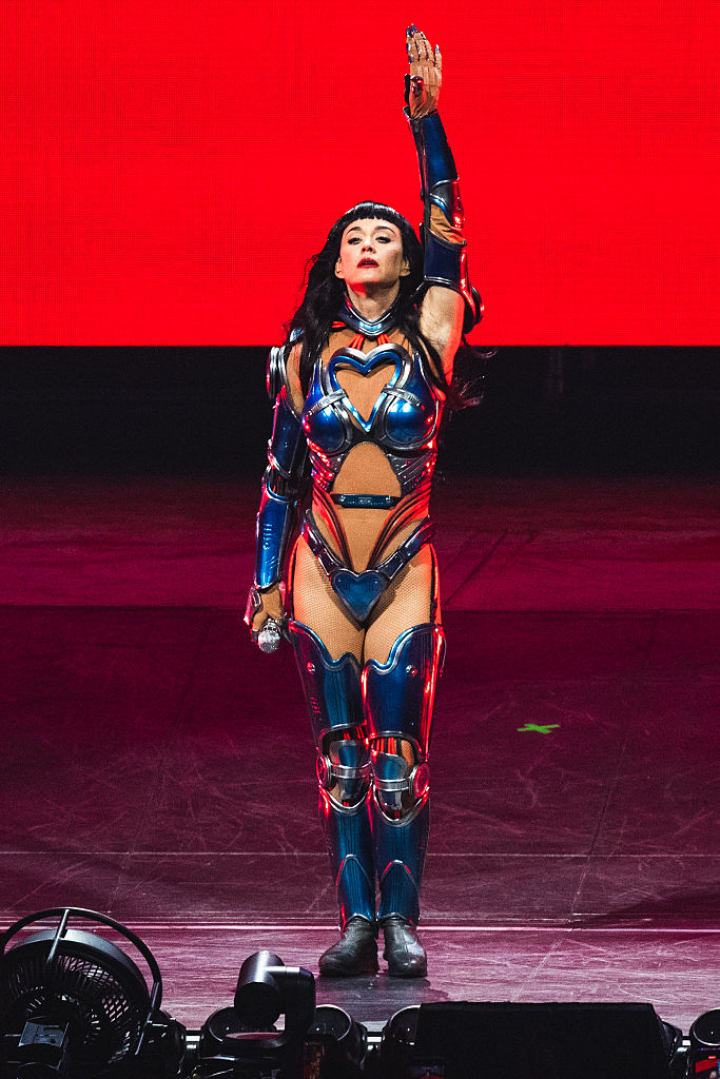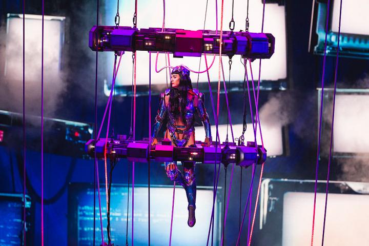 Siete minutos antes de las 21:00h las pantallas comenzaron a resquebrajarse bajo una machacona base House para dar pase a la intro distópica y de estética de videojuego que acompaña a Lifetime. Como si Tom Cruise en Misión Imposible, Perry apareció a mitad de este infinito elevada por una serie de tubos y cuerdas como una armadura que la convertía en especie de Juana de Arco en gravedad cero. Eso sí, esta vez sin viaje de Jefa Bezos para interpretar Artificial, canción que abrió el primero de los cuatro bloques del directo a la que seguiría un Chained to the Rythym hiperestimulado con bailarines vestidos como rastreadores intergalácticos o un Teary eyes, que como todo su reciente disco haría las delicias de una clase de spinning.