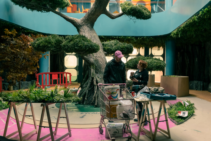 El director de arte revela que trabajar con Pina y Martínez Lobato implica no tener el guión completo al empezar el proyecto, por lo que tienen que diseñar los espacios anticipando futuras necesidades. En este caso, además del gimnasio o la guardería, Alcañiz explica que colocaron muchas puertas porque no sabían cómo iba a desarrollarse la acción. “En este set tenemos un apartamento completo y hay otros tres apartamentos en Tres Cantos, en las instalaciones de Netflix”, cuenta Alcañiz sobre la logística para grabar.