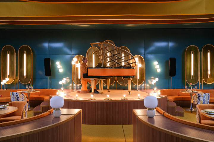 “Queríamos algo elegante pero sin olvidar que es un búnker subterráneo, que no fuera depresivo tampoco y que quisieras ir”, comenta Abdón, que explica que tomaron como referencia los años 50. “Jugamos con los colores y los materiales, probamos mucho y cambiamos mucho y terminamos eligiendo el turquesa y el ámbar”, señala el director de arte.