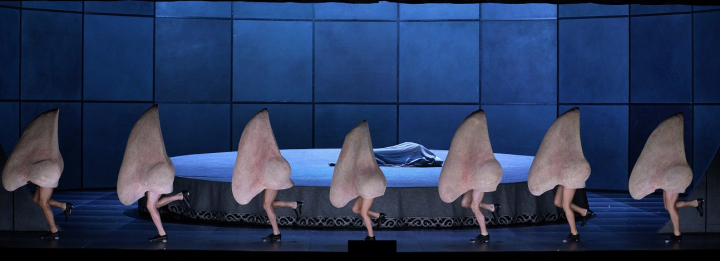 Barrie Kosky el director de escena también se aplica y se ajusta a lo que sabe hacer. Y lo hace bien creando imágenes atractivas. Imágenes que, si no fuera por los sobretítulos que hay que leer para poder enterarse de lo que dicen, mantienen la mirada en el escenario cada vez que se abre el telón. Un telón que se abre y se cierra muchas veces, pues su propuesta está trabajada en escenas.