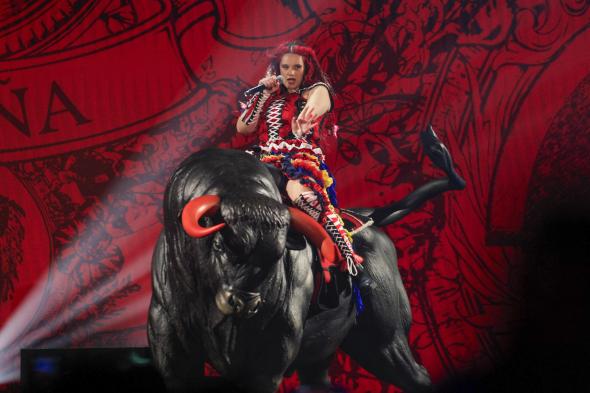 Para empezar, por el obvio y gigantísimo toro al que se subió en un fragmento de la canción, aparte de su look, que evocaba los colores de la bandera. Tampoco faltaron peinetas, fútbol y hasta unos tangas rojos con su nombre que exhibieron sus bailarines.