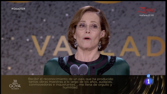 El cineasta trabajó con la actriz que dio vida a la teniente Ripley en Alien en Un monstruo viene a verme. "Me habéis hecho sentir una verdadera reina", ha comenzado diciendo antes de intentar agradecer el galardón en español. "Recibir el reconocimiento de un país que ha producido obras maestras a lo largo de los años, audaces, conmovedoras e inquietantes... Me llena de orgullo y de humildad", ha señalado la actriz.