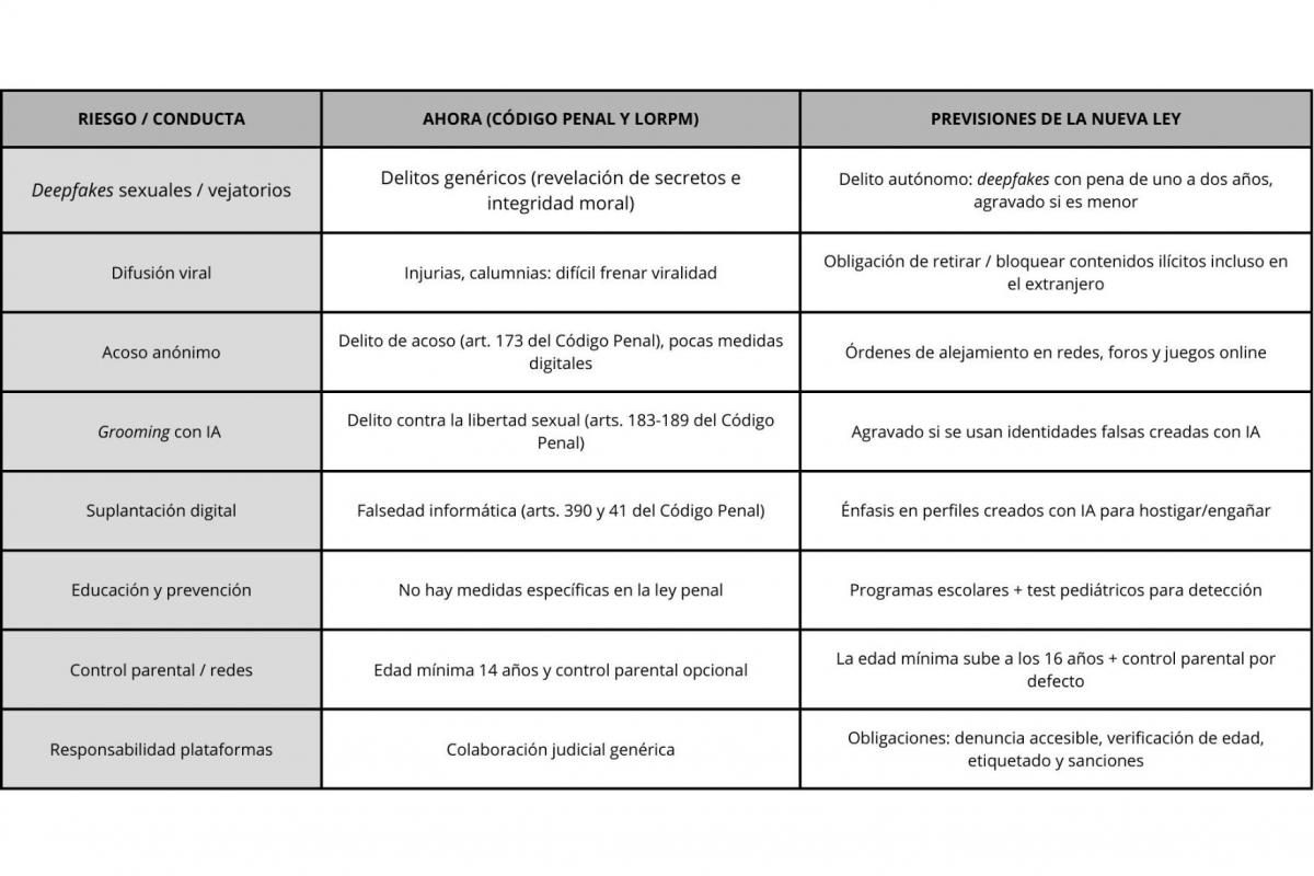 En cambio, la nueva ley pretende crear un nuevo tipo penal y un nuevo delito que es la creación y discusión de deepfakes, entre otras acciones, como se puede observar en la tabla que hay a continuación. Sin embargo, el experto teme que, como mínimo, quedan dos años hasta que se ponga en marcha: "Desde que la ley se publique, entre en vigor y los jueces lo empiezan a aplicar... Estamos hablando, como mínimo, del 2027".
