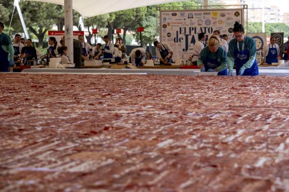 El plato en sí superó los 200 metros cuadrados. 80 cortadores se pusieron a la faena cortadores a las 11:00 horas del sábado y no terminaron hasta las 14:30, hora ideal para saborearlo.