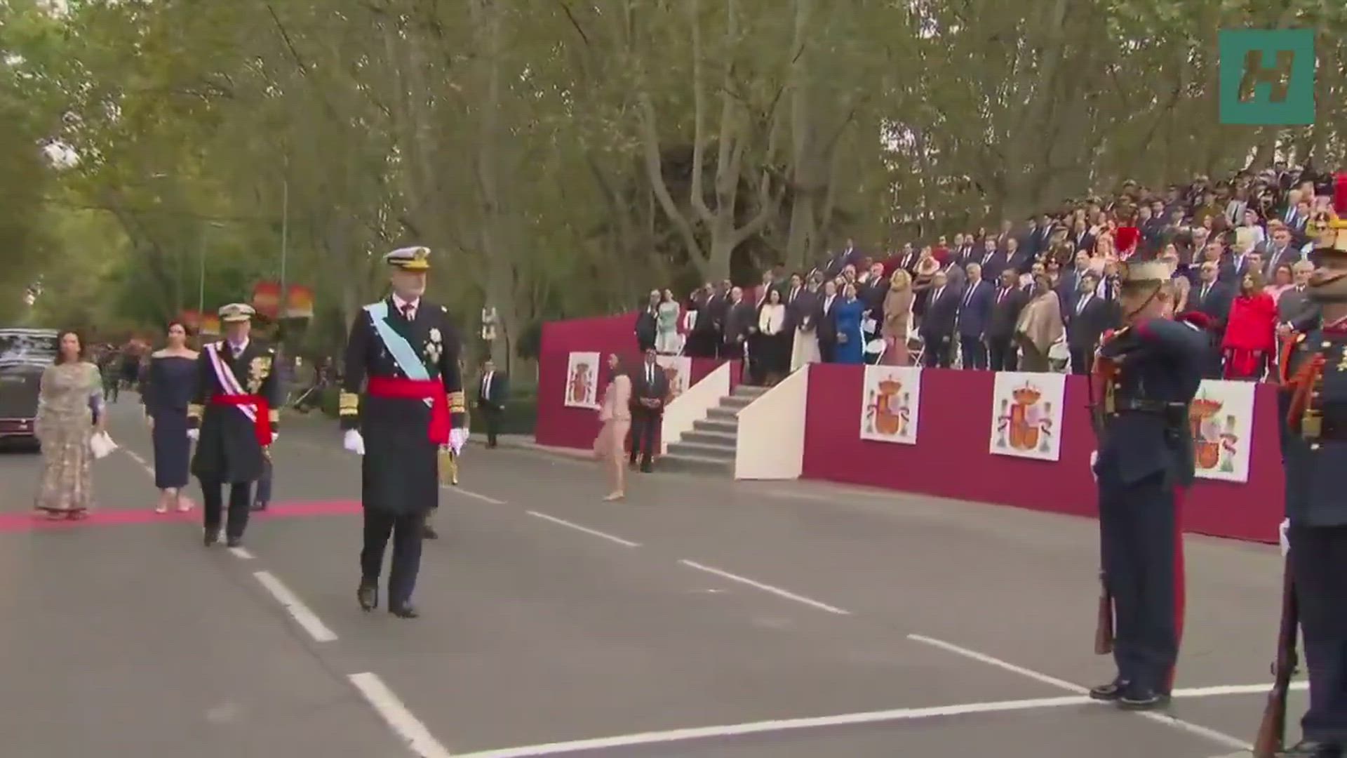 Empecemos con la reina Letizia, vestida de verde, o quizá de V.E.R.D.E., ella lo sabrá, que aprovechó ese momento habitual tras el recibimiento en el que Felipe VI pasa revista a las tropas y ella se queda con el presidente del Gobierno para comentar algo con él.