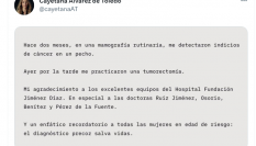 "Si no hubiera hecho esto todos los años, hoy no tendría el pecho izquierdo", continúa su publicación con la que quiere dejar claro que no pretende hablar de su salud y reconoce haber dudado mucho antes de hacerlo público, pero sí que con su testimonio pretende mandar un contundente mensaje a todas las mujeres para que se hagan sus controles y mamografías todos los años. "Tu vida depende de ello", terminan diciendo.