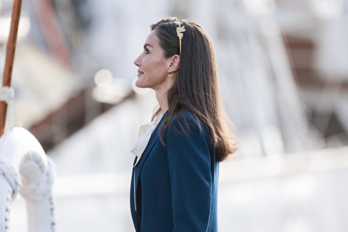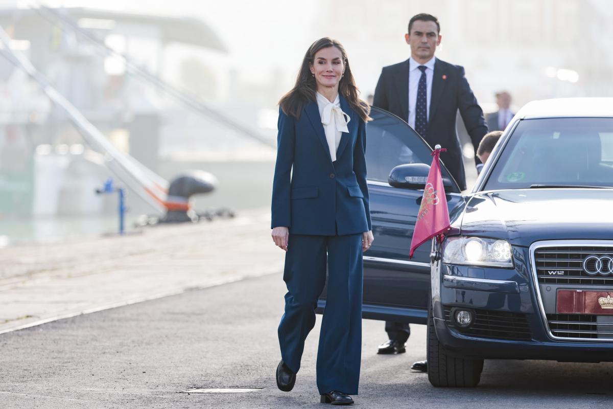 El 'look' de Letizia para despedir a Leonor, al detalle: en traje y a juego con el uniforme de la Armada
