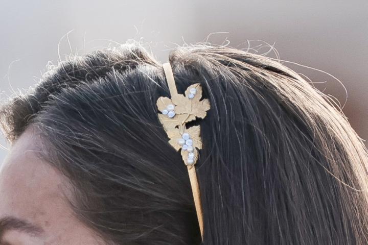 El pelo, por otro lado, se lo ha dejado suelto, como acostumbra a hacer. Aunque, para esta ocasión, se lo ha recogido tras las orejas con la ayuda de una diadema también dorada, como los pendientes. Esta está adornada con tres hojas sobre las que hay unos disimulados diamantes.