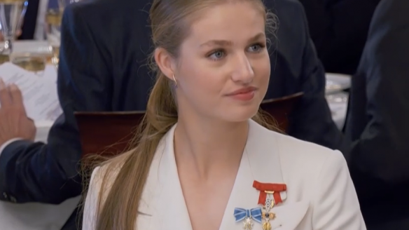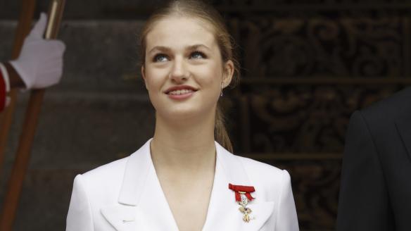La heredera al trono ha lucido un traje con pantalón de corte recto y americana cruzada entallada en la cintura. Sobre la solapa de la chaqueta Leonor ha portado el Toisón de Oro, la máxima condecoración que otorga la Corona y que el rey le impuso a su hija en 2018, coincidiendo con el 50º cumpleaños del monarca. Por Uxía Prieto.