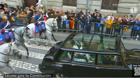 En dos Rolls Royce históricos de la Casa Real, el primero con los reyes Felipe y Letizia, el segundo, con la princesa Leonor y la infanta Sofía. El recorrido, de unos 12 kilómetros, terminará en el Congreso de los Diputados, donde los reyes y la princesa Leonor serán recibidos por el presidente del Gobierno en funciones, y después, en la escalinata de los Leones, por los presidentes del Congreso y el Senado.
