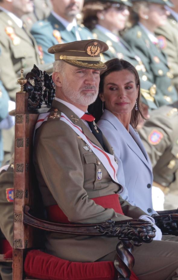 Lo hizo acompañado por Letizia y con su hija mayor, la princesa Leonor, allí presente como cadete, puesto que es el centro en el que ha iniciado su formación castrense. Desfiló junto a sus compañeros y lo hizo con seriedad y discreción.