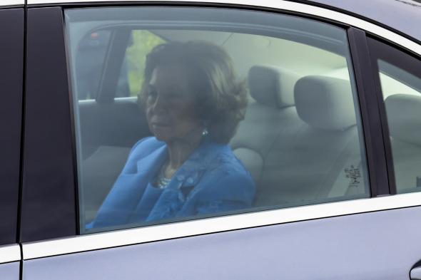 La monarca ha sido vista llegando en coche al segundo enclave que han escogido los novios para continuar la celebración de su boda. Viajaba en el asiento de atrás del vehículo luciendo un conjunto de color azul al completo.