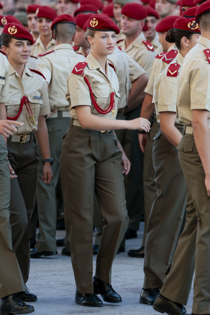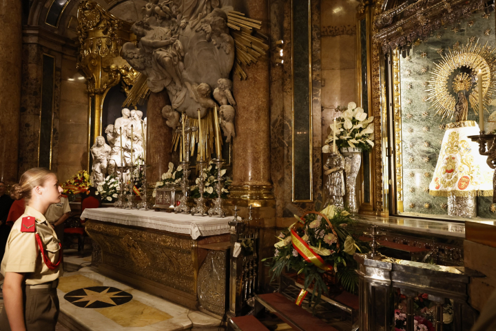 Se trata de la ofrenda a la Virgen del Pilar y al ser un acto de carácter religioso, la asistencia es voluntaria. La princesa de Asturias no se lo ha perdido y primero se ha colocado en formación vestida de uniforme junto al resto de sus compañeros frente a la basílica para después acceder al templo.
