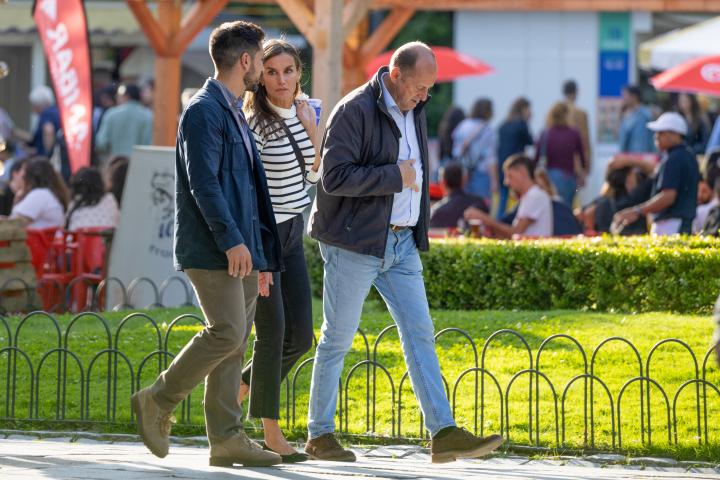 La reina ha lucido durante su paseo un look informal con un jersey de raya marinera con unos vaqueros negros, combinado con un bolso cruzado de tachuelas.