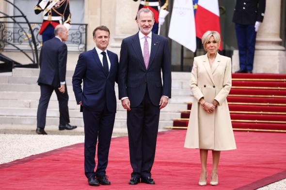 Aunque los dos habían confirmado su asistencia, finalmente el rey ha acudido solo y ha posado con el matrimonio Macron a las puertas del Elíseo.