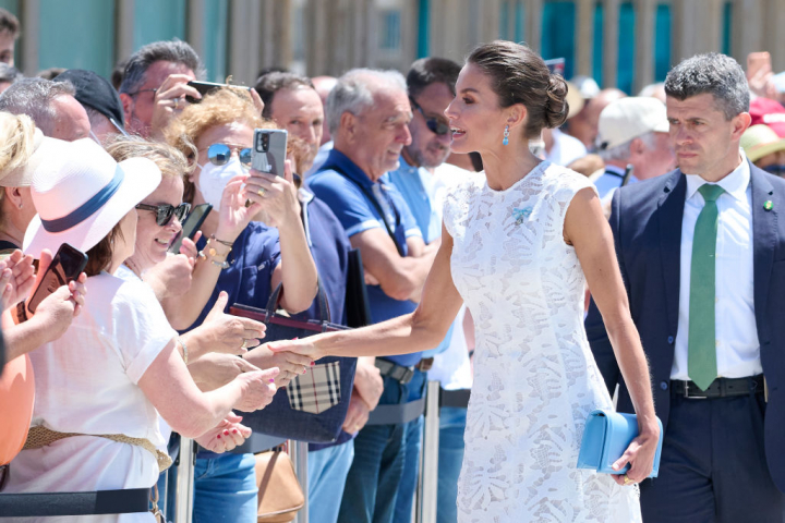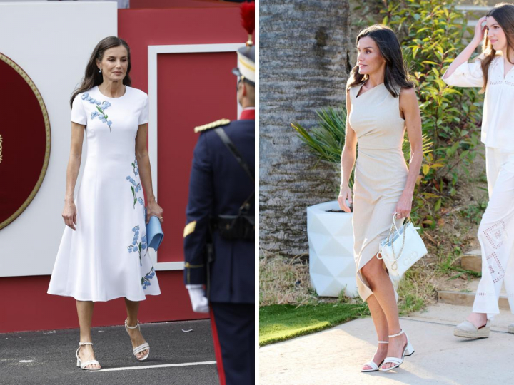No es de extrañar que Letizia reutilice prendas para actos de su agenda de reina. Y es precisamente lo que ha pasado en esta ocasión. Ha lucido un vestido blanco con falda estilo midi, cuello redondo y las mangas cortas. Lo característico de la pieza son las flores azules estampadas.