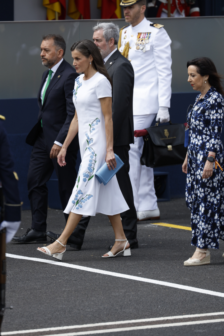 En la reunión del día antes de la entrega de los galardones, la reina lució el diseño de color blanco, al día siguiente, el mismo pero en negro. Para el desfile de este sábado, en el archipiélago canario, se ha decantado por las más claritas.