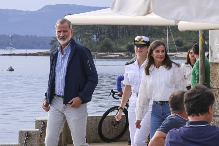 La princesa y sus padres han sido vistos en la tarde de este sábado paseando por Vilagarcía de Arousa. Tanto Felipe como Letizia se han decantado por sendos outfits informales, propios del clima otoñal que ya reina en Galicia, mientras que Leonor ha lucido el uniforme blanco del ejército de mar.