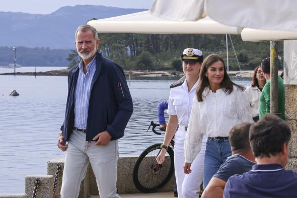 La princesa y sus padres han sido vistos en la tarde de este sábado paseando por Vilagarcía de Arousa. Tanto Felipe como Letizia se han decantado por sendos outfits informales, propios del clima otoñal que ya reina en Galicia, mientras que Leonor ha lucido el uniforme blanco del ejército de mar.