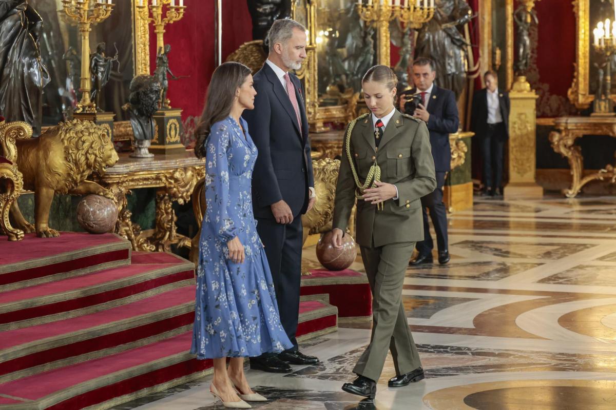 Además, la princesa de Asturias ha debutado en la recepción posterior en el Palacio Real junto a los reyes Felipe y Letizia. Leonor ha estado presente tanto en el tradicional besamanos como en el cóctel y los corrillos posteriores junto a periodistas y las más altas autoridades del Estado.