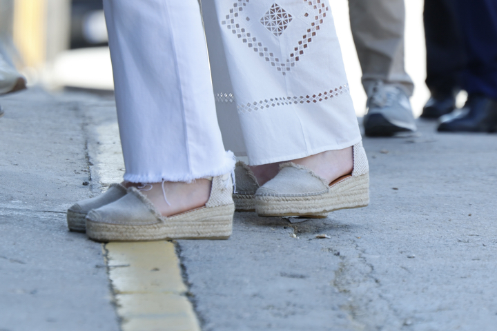 La heredera ha apostado por un vaquero blanco, combinado con una camisa de mangas abullonadas, mientras que su hermana pequeña ha preferido un pantalón ancho con brocados y una blusa a juego. Ambas han lucido el mismo modelo de alpargatas, con la misma cuña y en tono beige.