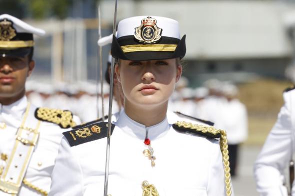 Bajo el sol radiante de Marín (Pontevedra), Leonor de Borbón ha recibido este miércoles, día de la virgen del Carmen, la Gran Cruz del Mérito Naval, de manos de su padre, el rey Felipe. La princesa de Asturias no ha recibido su despacho real, el título que acredita la graduación y el nombramiento de un militar en la Armada, porque le corresponde hacerlo a sus compañeros de promoción, que aún deben completar tres años más de formación.