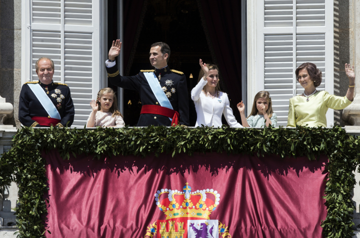 El 19 de junio de 2014 Felipe VI juraba la Constitución en el Congreso de los Diputados junto a la reina Letizia y sus dos hijas, la ya princesa de Asturias, Leonor, y la infanta Sofía. Desde el balcón observaban emocionadas la reina Sofía y la infanta Elena pero no el rey Juan Carlos, que después de colocar a su hijo la banda de Capitán General decidió no acudir al Congreso.