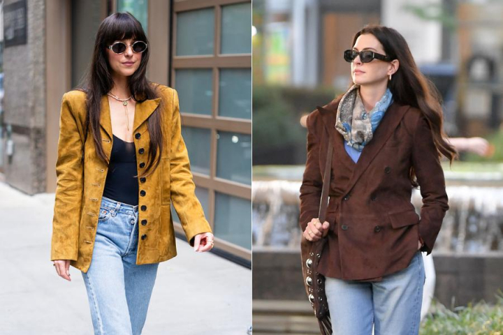La chaqueta de ante es la protagonista del otoño por el tejido y es un básico en cualquier silueta. Desde estilo bomber como la que ha lucido Hailey Bieber, hasta en versión americana cruzada como Anne Hathaway, que la eligió como pieza principal de su look para grabar un paseo por la ciudad en marrón chocolate, el nuevo negro para esta temporada.
