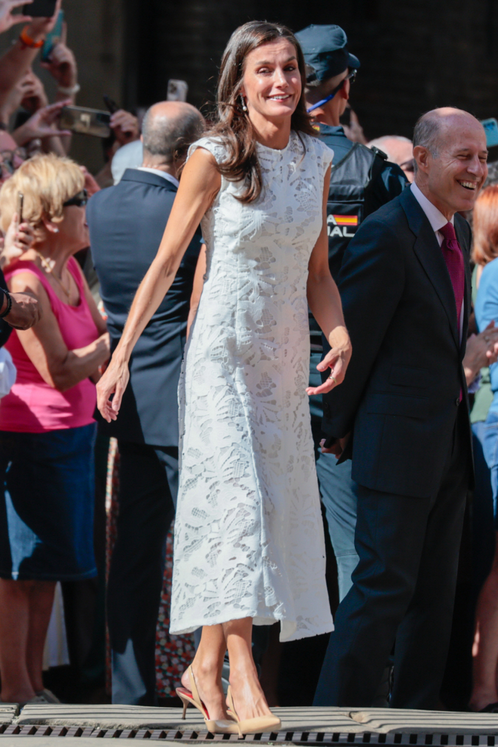 La prenda recuerda inevitablemente a uno de los vestidos favoritos de la reina Letizia. Se trata de un diseño blanco de Sfera también de encaje y con un patrón similar que la consorte volvió a lucir el pasado viernes en Pamplona durante la celebración del VI Centenario del Privilegio de la Unión.