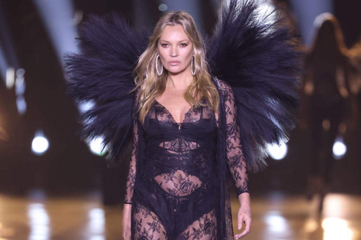 Moss, a sus 50 años, ha participado por primera vez en un desfile de la firma con un vestido de encaje negro transparente y un par de alas de tul negro a ritmo de la canción I love rock 'n' roll de Joan Jett & the Blackhearts.
