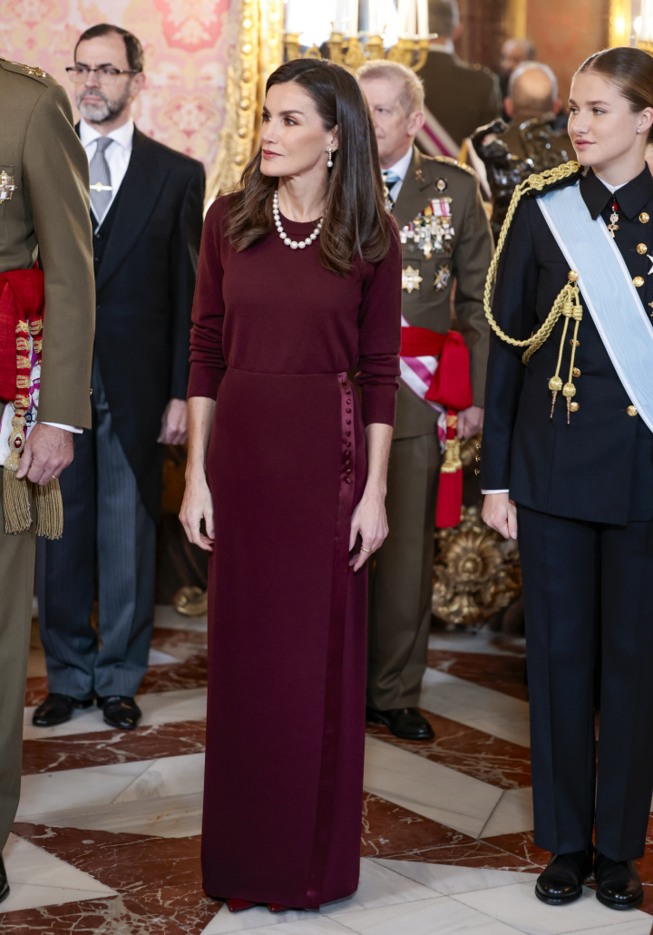 Es el caso de la reina Letizia, que manteniendo su habitual sobriedad para este acto, ha elegido un conjunto monocromático en burdeos, el color de la temporada. Se trata de una falda con botones, detalles en raso y una abertura lateral, que ha combinado con un jersey fino de punto en el mismo tono.