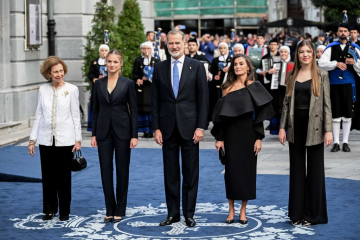 El negro ha sido el color protagonista de la velada ya que, además de Letizia, sus hijas Leonor y Sofía también han apostado por él. En el caso de la heredera, con un esmoquin con el que se desmarca de los vestidos de otras ceremonias, mientras que la infanta ha combinado un pantalón ancho con una americana dorada.