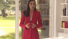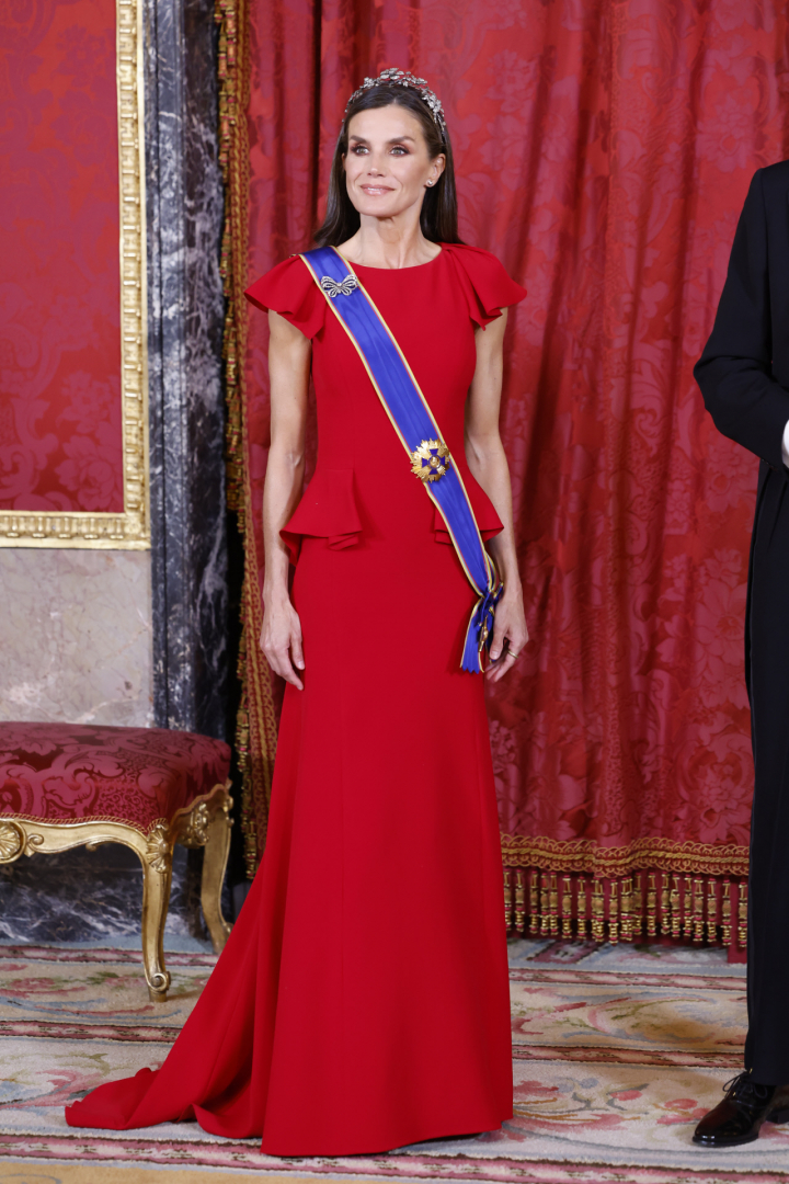 Además, para la ocasión, la reina ha estrenado un nuevo vestido en color rojo. Se trata de un diseño de corte peplum con una ligera cola y discretos volantes en las mangas. Letizia ha lucido unos zapatos peep toes a juego con el mismo tono de la prenda.