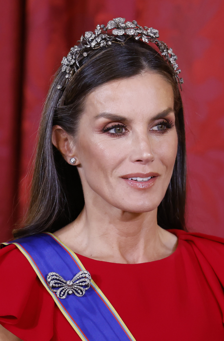La reina ha recuperado la que fue su tiara favorita en su época de princesa de Asturias, la tiara floral, que no lucía desde 2019. En esta ocasión, la consorte ha evitado recogidos o moños pulidos y ha optado por llevar su melena suelta, colocándose la tiara a modo de diadema.