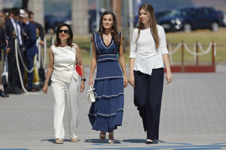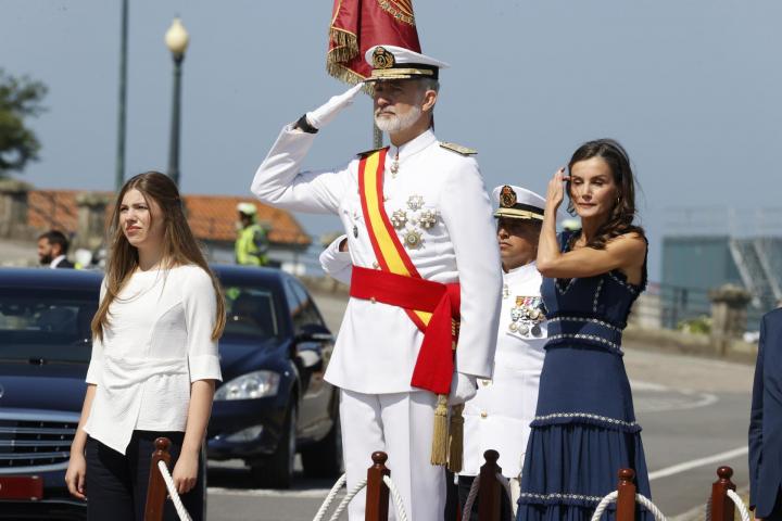 La reina Letizia ha seguido la imposición desde la tribuna real, sin apartar la mirada de su hija mayor. Para la ocasión, la consorte ha elegido un vestido azul marino con escote en V y de estilo boho perfecto para un día veraniego y soleado como el de este miércoles.