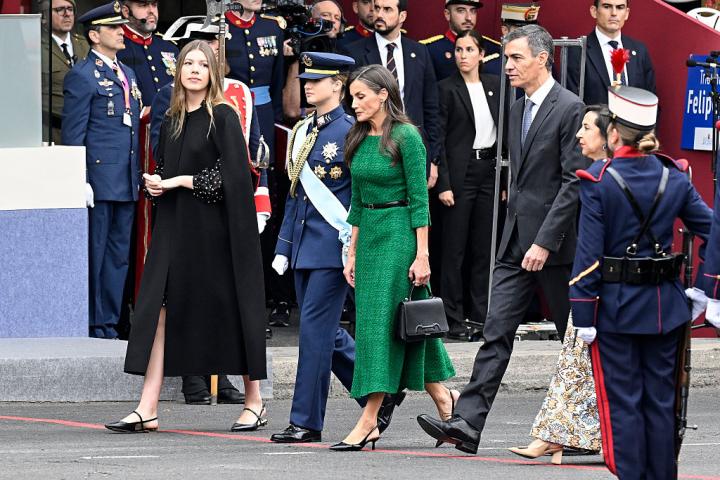 La reina ha estrenado un vestido muy estilo Kate Middleton y ha recuperado los pendientes largos de esmeraldas de Tous en el desfile militar del 12 de octubre.