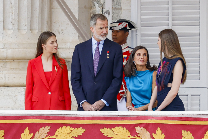 Diez años después de la proclamación de Felipe VI, la familia real ha salido al balcón principal del Palacio Real para celebrar esta primera década de reinado. Para esta ocasión especial, la reina Letizia ha repetido la tónica de las últimas grandes ocasiones y ha optado por reciclar un conjunto de su armario evitando acaparar todo el protagonismo.