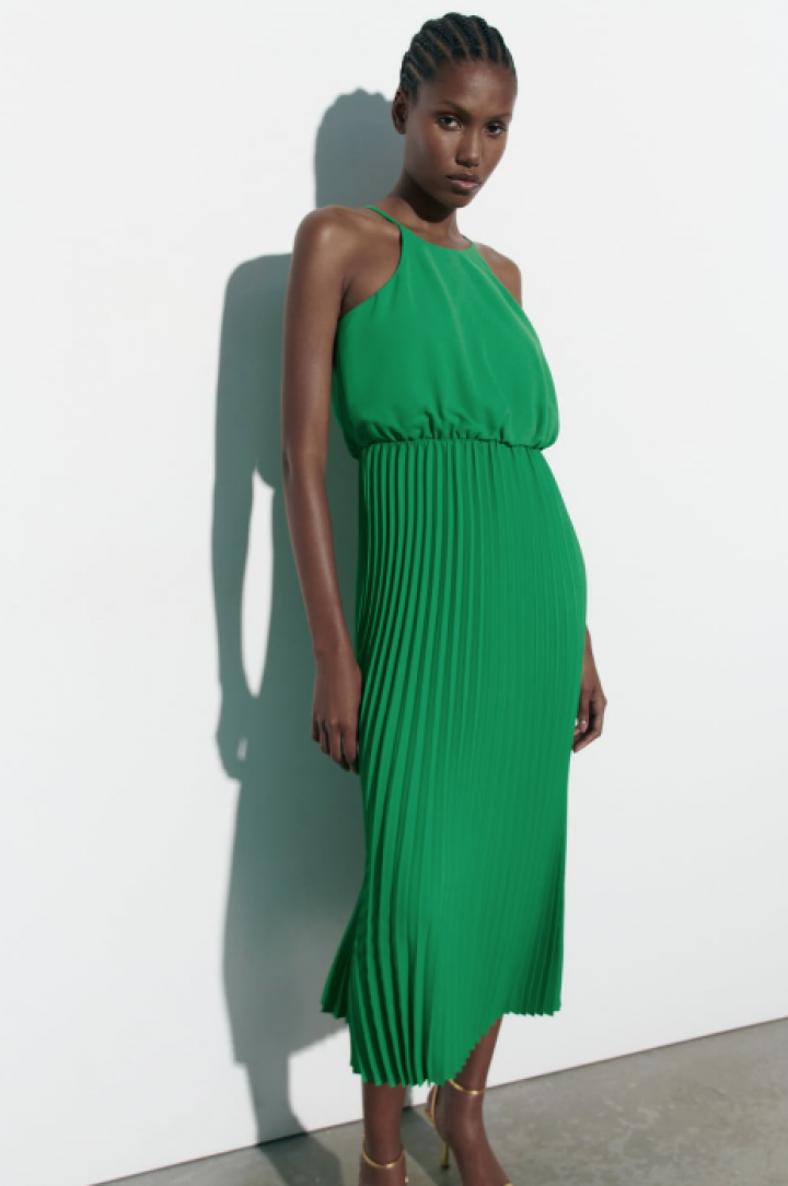 Para las que sean fans del plisado hay varias prendas que solucionarán cualquier evento. Desde un vestido plisado de manga corta en color turquesa hasta otro de escote halter en un verde vibrante perfecto para los meses de verano. Las que prefieran falda también tienen varias opciones, entre ellas, una en tono rosa tiza perfecta para vestir incluso cuando llegue el otoño.