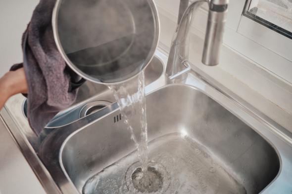 1. Precalentar las tuberías. Si el desagüe está completamente bloqueado hay que verter agua hirviendo para ablandar la grasa y facilitar el acceso del detergente.